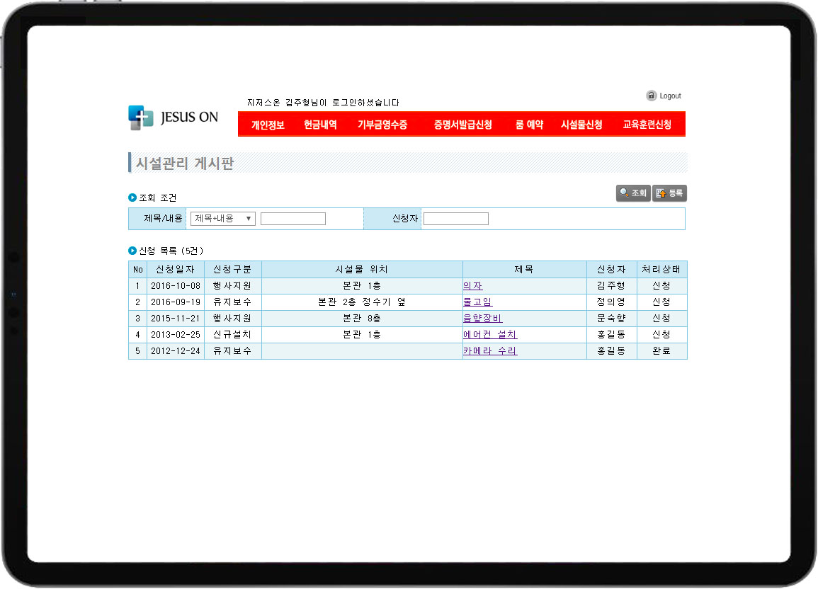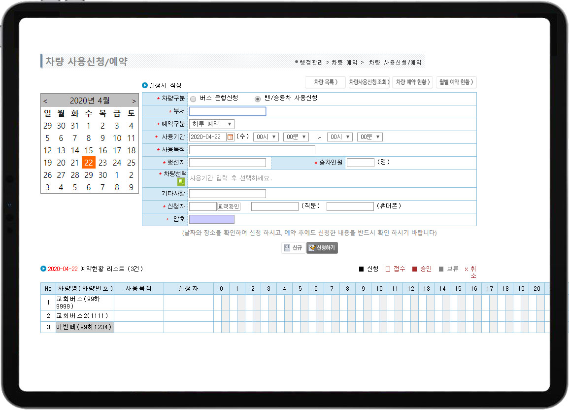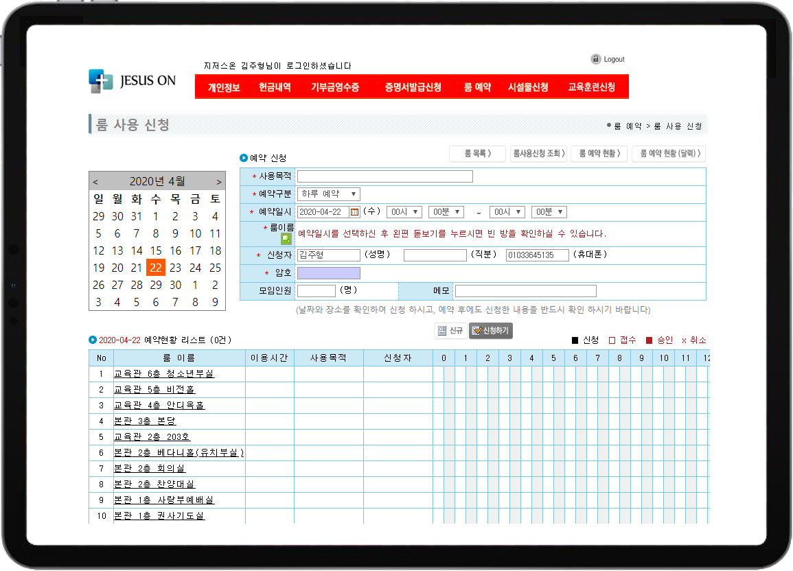 장소예약, 시설물, 교회차량예약, 교육훈련을 신청 합니다.