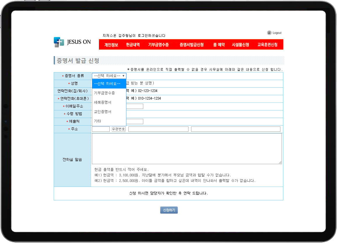 기부금영수증, 세례증명서, 교인증명서를 신청 합니다.